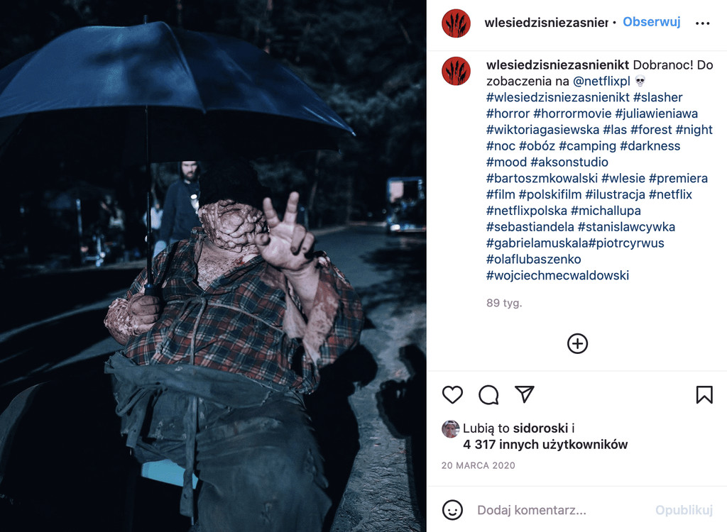Stworzyliśmy profil filmu na Instagramie: @wlesiedzisniezasnienikt, na którym zwiększaliśmy zainteresowanie filmem przybliżając sylwetki postaci z filmu. Publikowaliśmy serię filmów zrealizowanych na planie na bazie stworzonych przez nas scenariuszy, specjalnie na potrzeby social mediów, m.in. Wikipedię horroru czy spot z filmowym kierownikiem obozu.